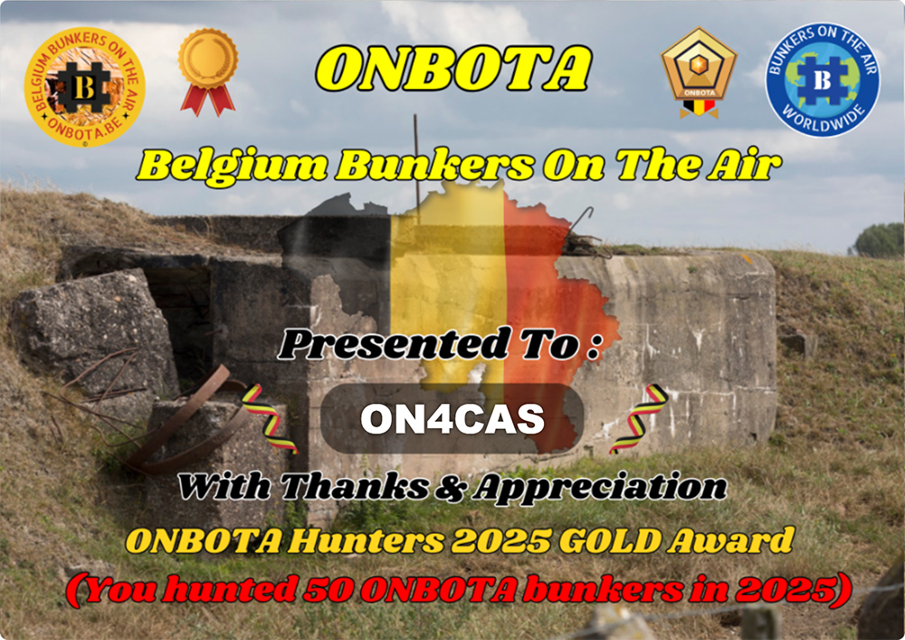 With the exception of SOTA (and of course IOTA), I haven’t really taken part in many of the various “OTA – On The Air” activities so far. However, on November 11, 2025, there was a special event organized by the Belgian branch of the Bunkers On The Air group, so I decided to put in some effort. It paid off — a fun experience and I even managed to earn the Gold Award right away!